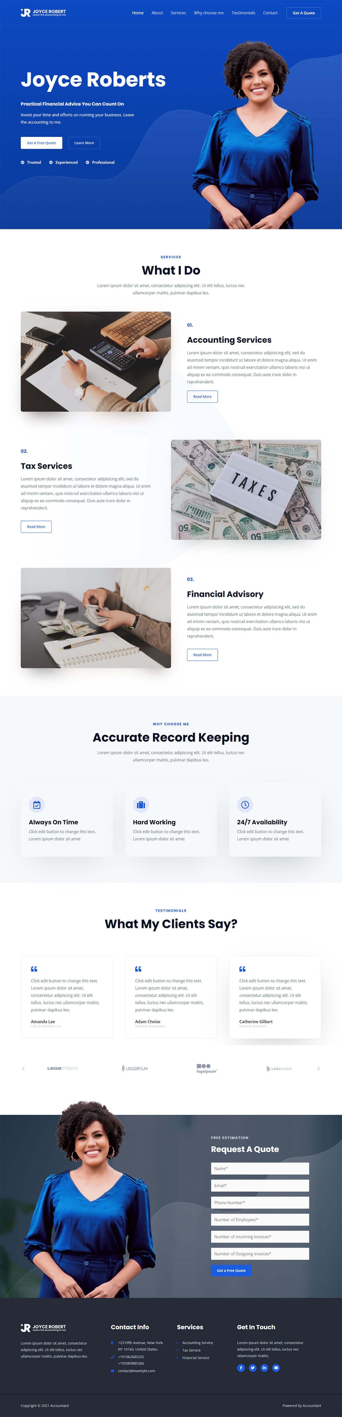 The Chartered Accountant template avoids the usual seriousness of the niche while building the authority it needs using modern design and a bright blue color.