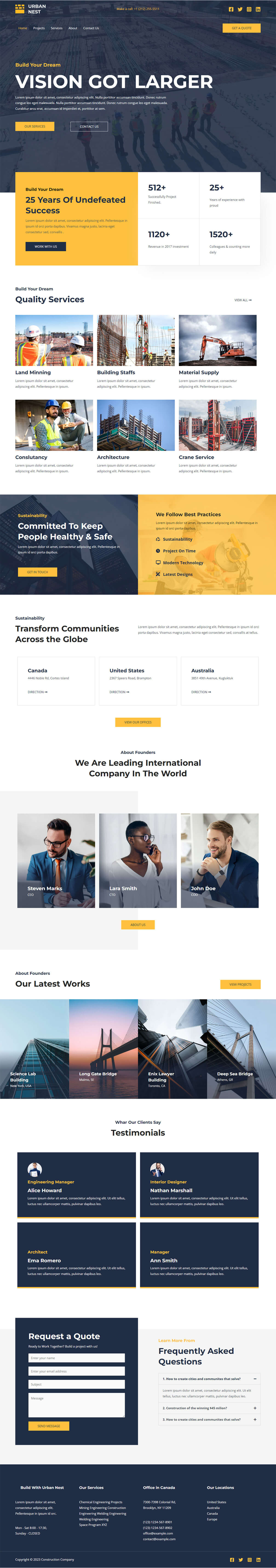 The Construction Company template comes with readymade pages for projects, services, about the company and a contact and quote page. Elements also include FAQs, testimonials, social media, a contact form and very attractive headers and footers. Everything a business needs for their online presence!