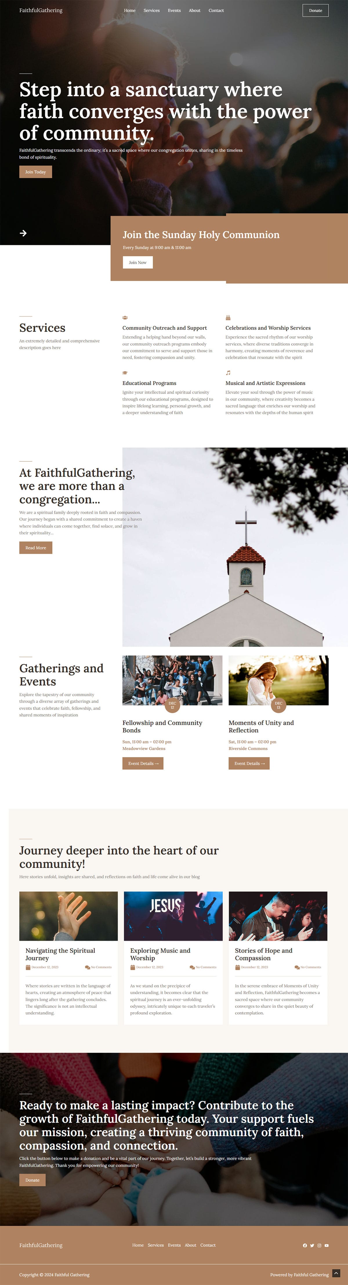The Faithful Gathering Church template is an inclusive design that offers a warm welcome to everyone. It’s ideal for churches, community groups, faith groups and any type of organization.