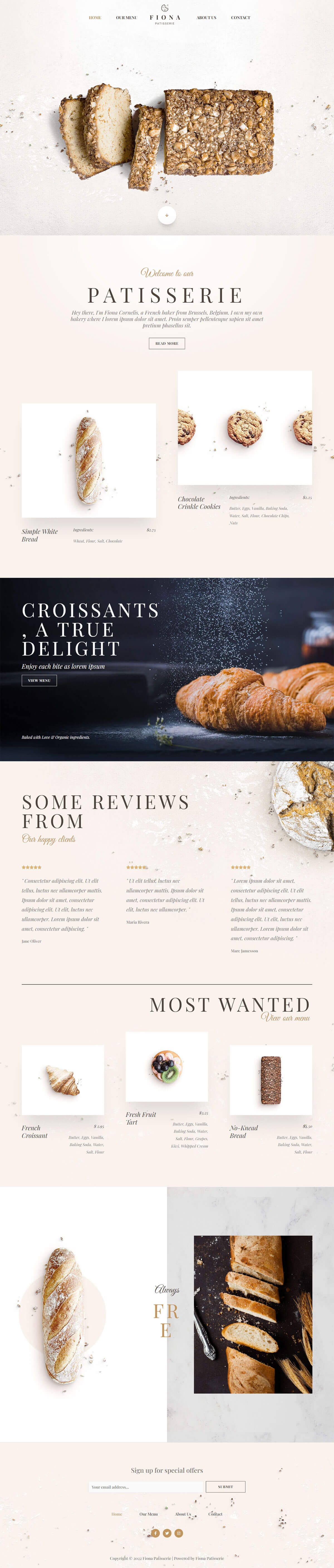 The Fiona Patisserie template is a light and engaging food template that opens with a large slider with high quality images and a simple menu up top. The page unfolds into a light, engaging design with parallax effect and more imagery.