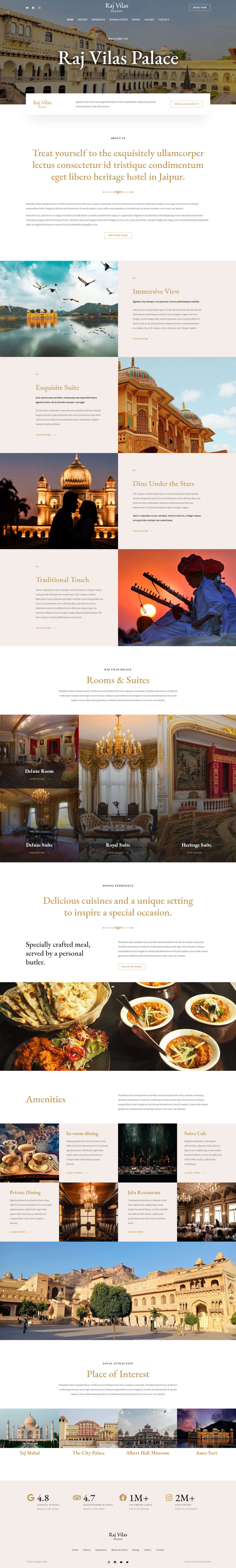 From the rooms and suites to the dining experience, and walkthrough of the entire property, your heritage hotel website template comes equipped with everything you need to draw your customer’s attention.