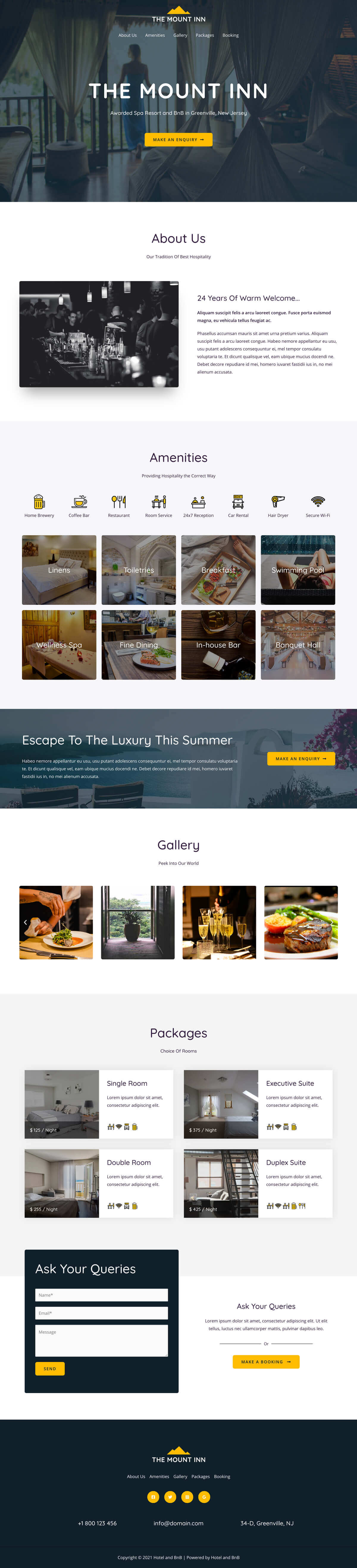 The design is modern with great balance and all the page features you need to introduce your property and engage with guests. There is also a clear call to action, a gallery page, booking form options and the opportunity to add anything you like to your website.
