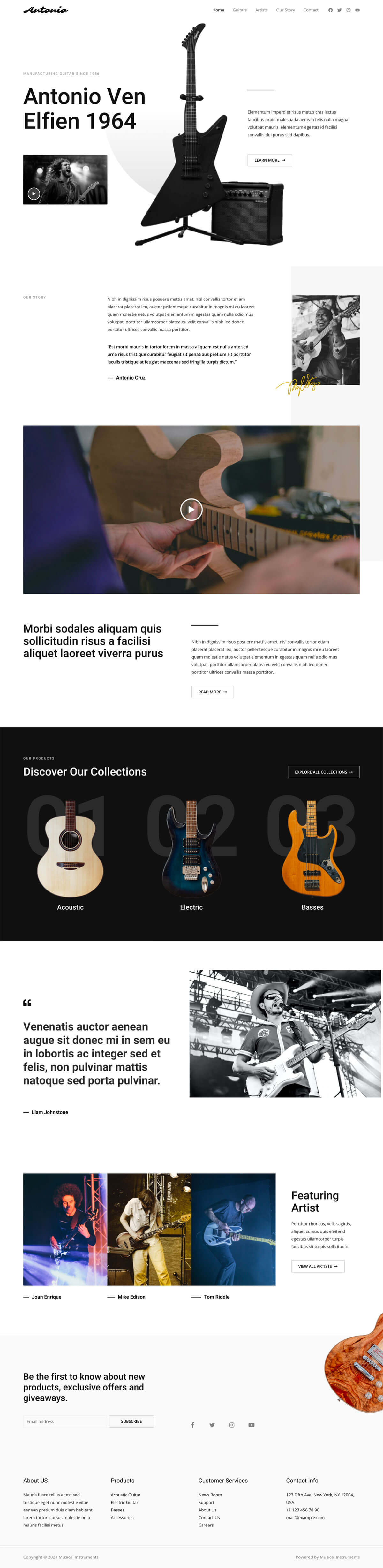 The Musical Instruments template could be perfect for instrument makers, musicians, bands and anyone involved in the music industry. It’s a light theme with lots of whitespace, an engaging header with image, video and audio elements, product areas and a range of flexible content areas throughout.