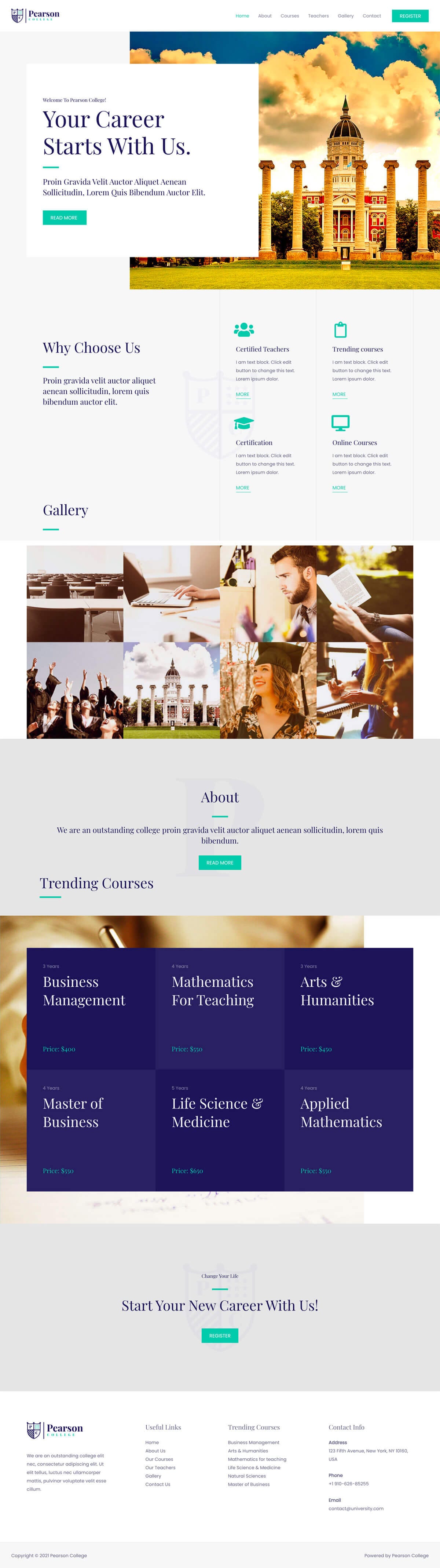 The Pearson College template is a calm, confident design that uses lots of whitespace and images to help tell the story. There are also some nice effects, inspiring fonts and a nice green contrast color to highlight specific areas.