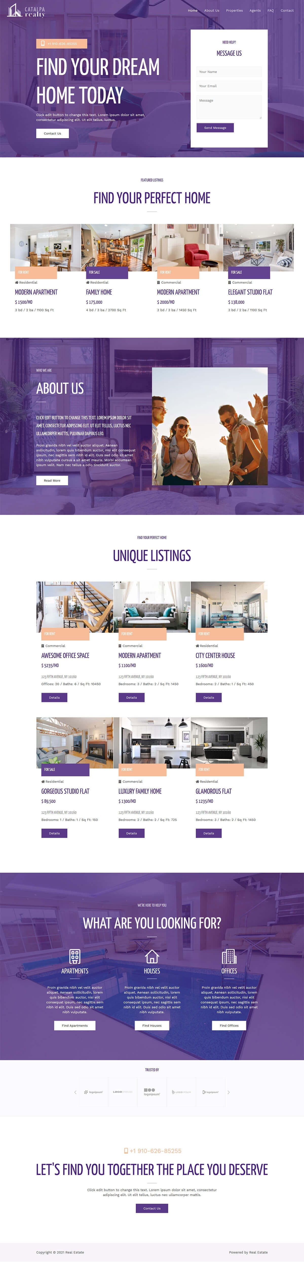 - Includes options for featured properties and agent bios