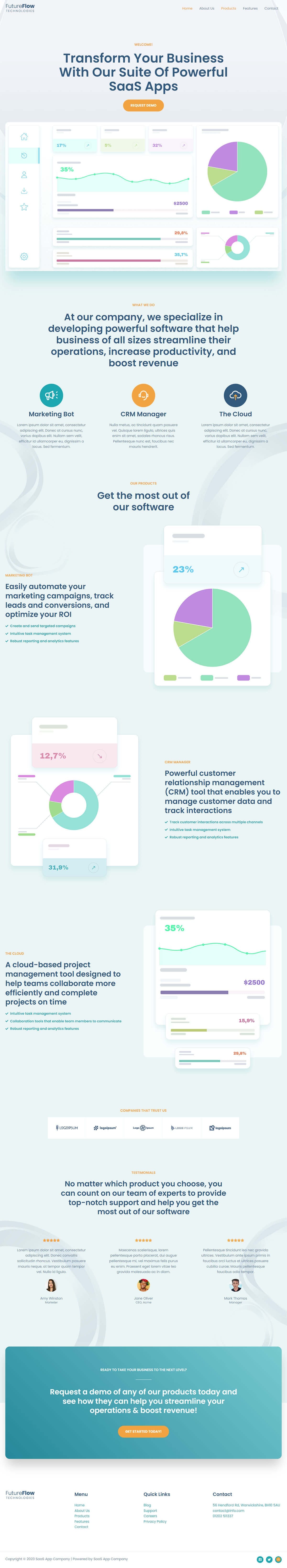 The SaaS App Company template is a vibrant, colorful design ideal for agencies and businesses of all types. It’s light, welcoming and uses graphics throughout to help engage and tell your story. Ideal for new businesses, upstarts, and startups.