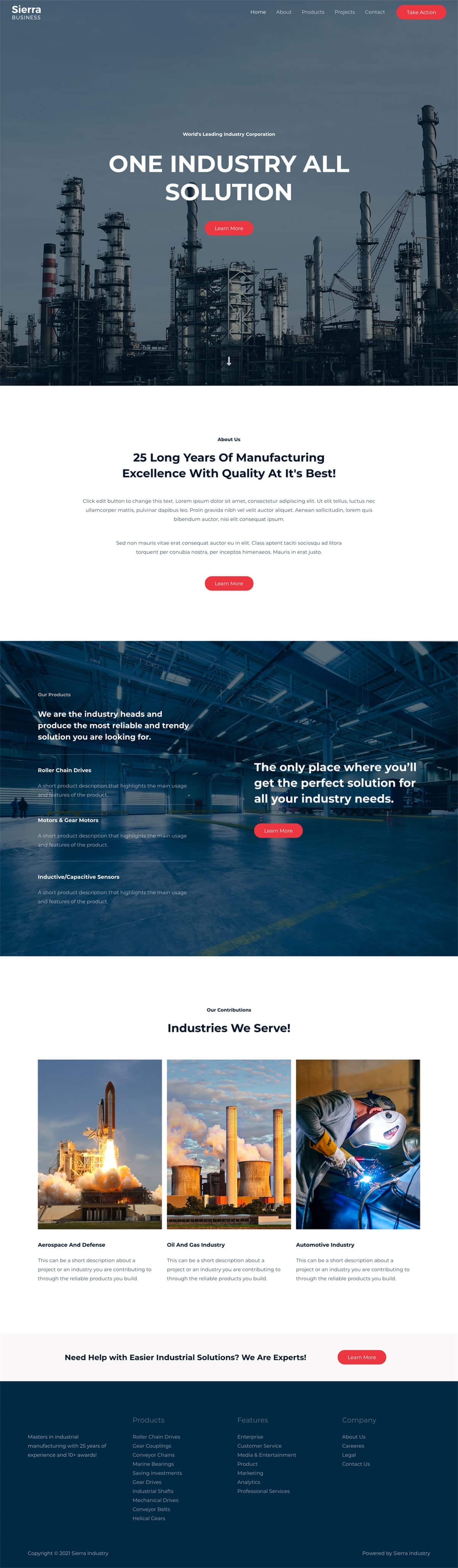 The Sierra Industry multipurpose template uses an illustrative full screen image to instantly communicate what it’s about. It also uses simple fonts and a bold contrast color for calls to action to help visitors engage.