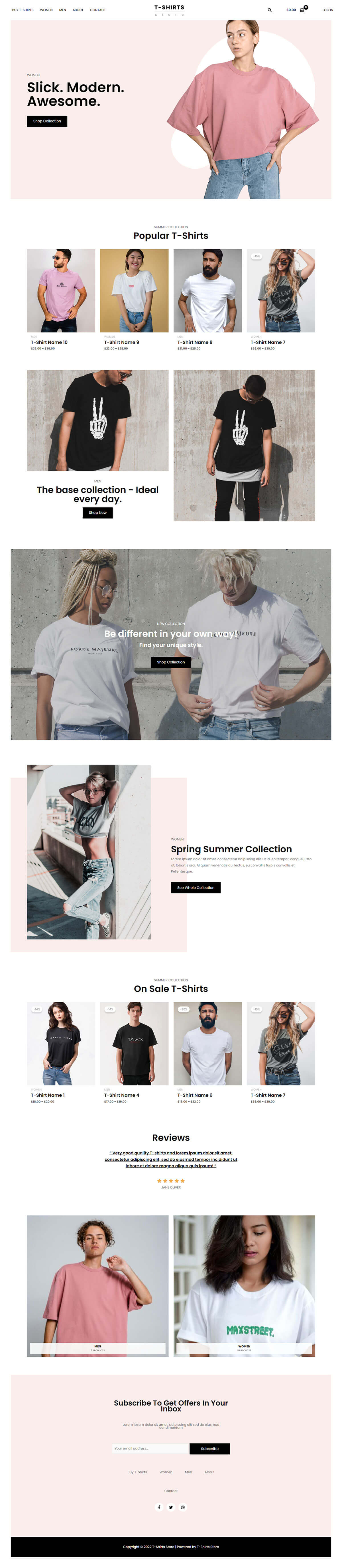 The T-Shirts Store template has a young feel with a pastel color palette, strong imagery and modern fonts. Combined with simple navigation and lots of whitespace, the store is a nice place to spend time, and money.