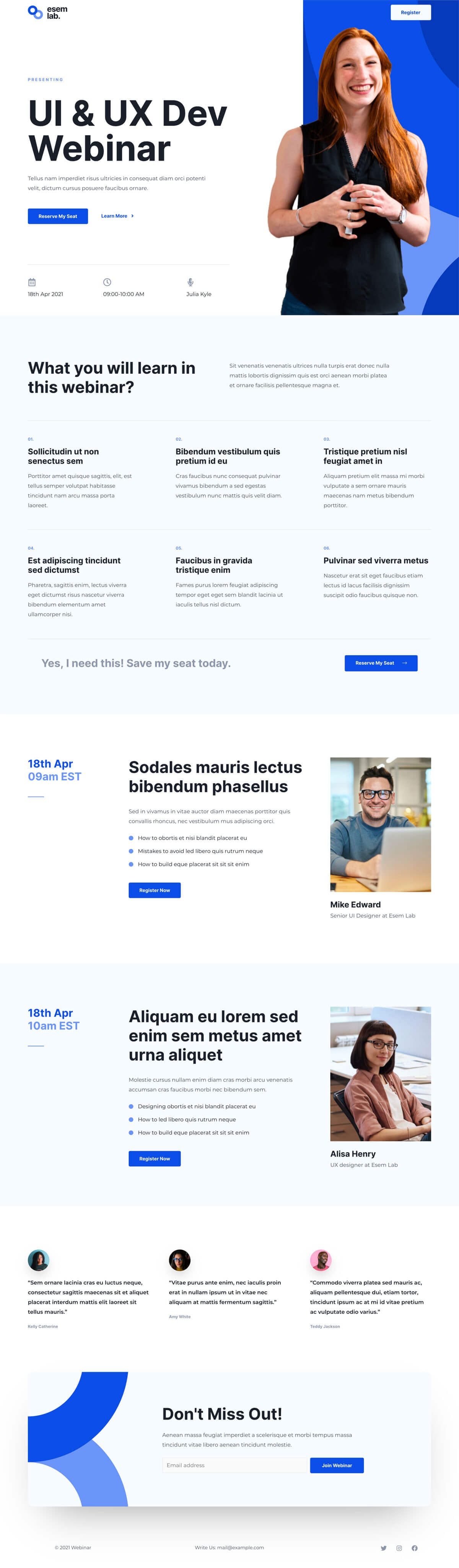 The page uses a reassuring blue color but can be customized with any color, font and layout. It’s fully responsive and compatible with leading page builders, so you can personalize the Webinar template however you like. It’s a well-designed theme ideal for many types of landing pages!