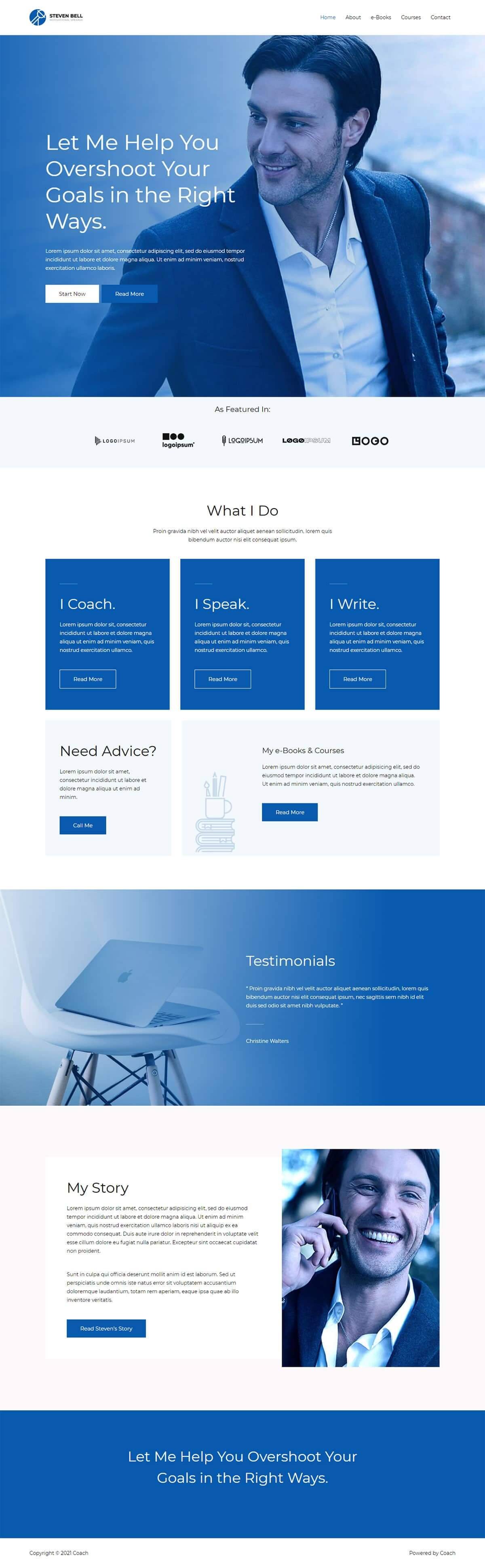 The Coach template uses a reassuring blue color known to give confidence. That’s a great choice for a coach, trainer or instructor but can be changed to fit your brand with ease.