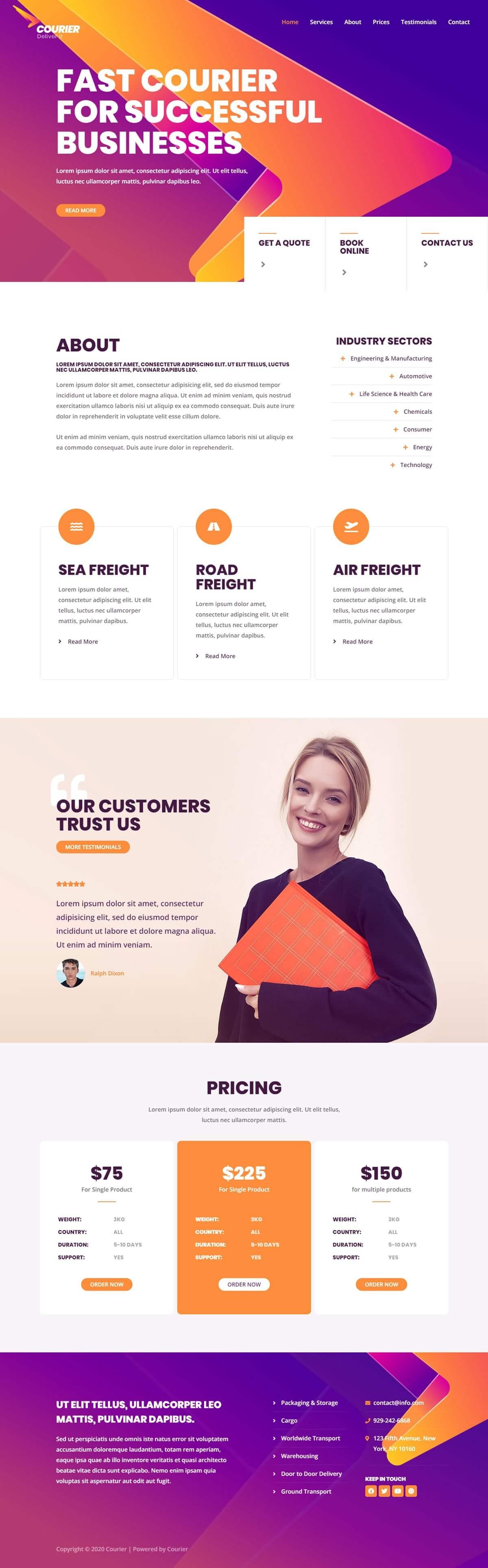 The Courier & Delivery Services template is ideal for couriers, moving firms, delivery services and anyone involved in moving things from A to B. It’s a bright, welcoming design with a bold header, attractive graphics and a strong headline.