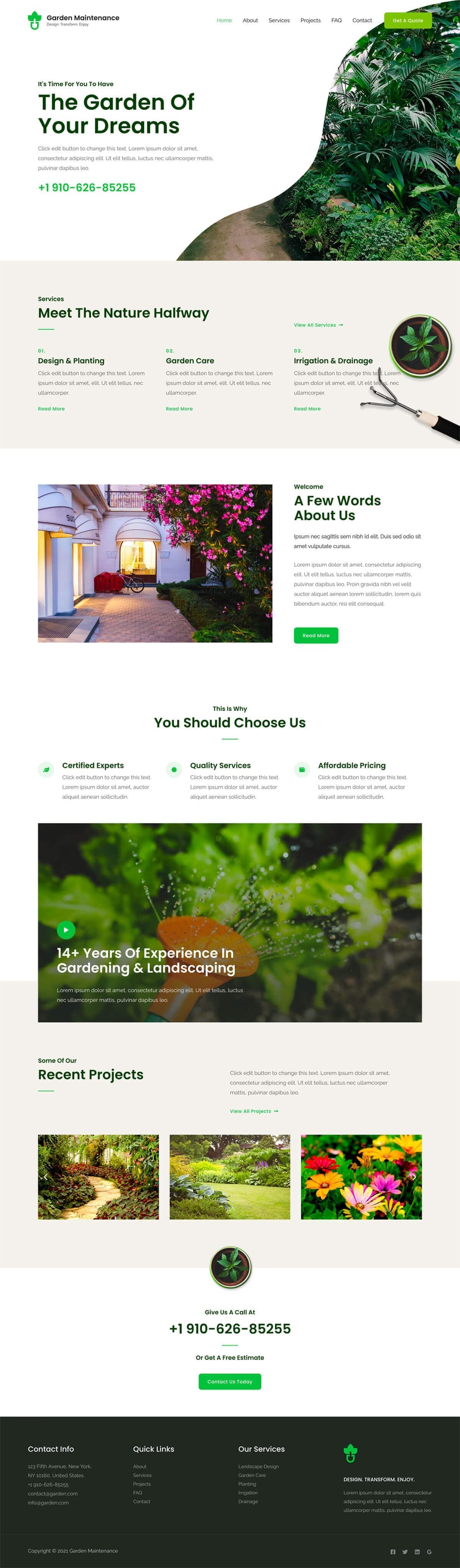 The Garden Maintenance template has a light, refreshing feel with lots of whitespace and a calm green colorway. It opens with a subtle slider with an image of foliage to immediately set the scene.