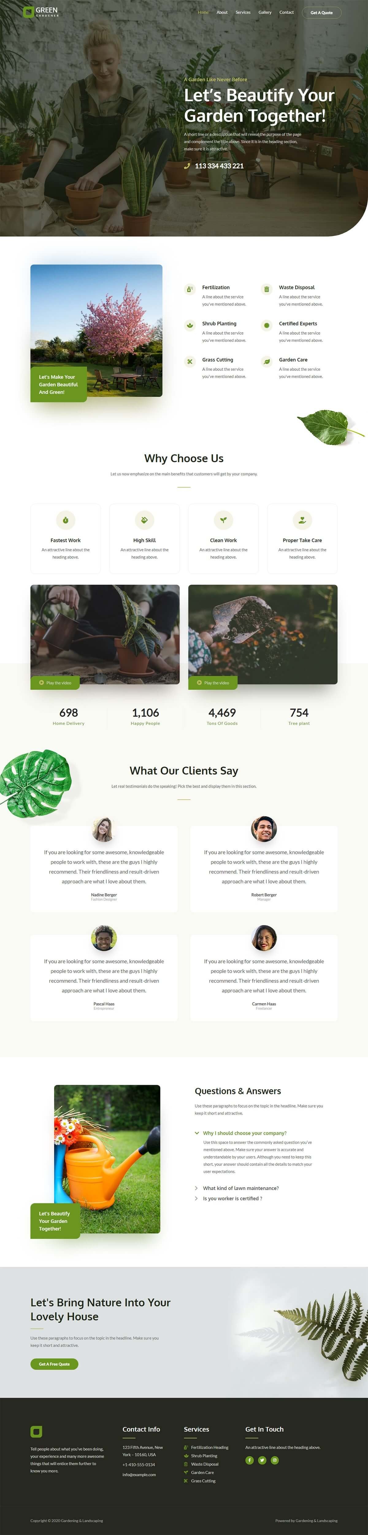 The Gardening & Landscaping website template is perfect for any business involved with gardening, landscaping, growing or farming. It uses sympathetic green colors throughout but could be easily customized to fit your brand.