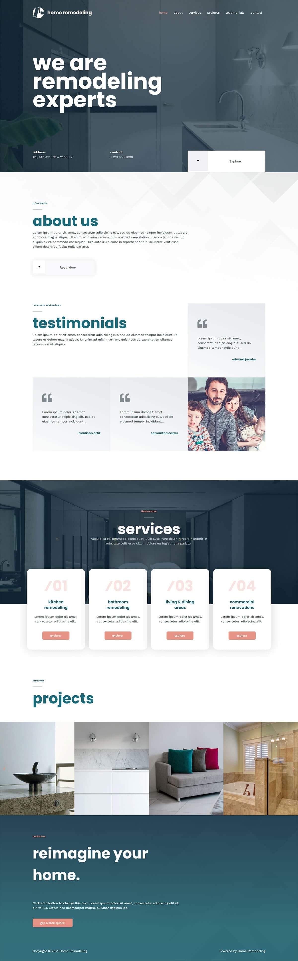 The Home Remodeling template is a contemporary design with simple colors and a largely grayscale layout. It combines gray areas with white fonts and white backgrounds to build an interesting layout that’s different from the norm.