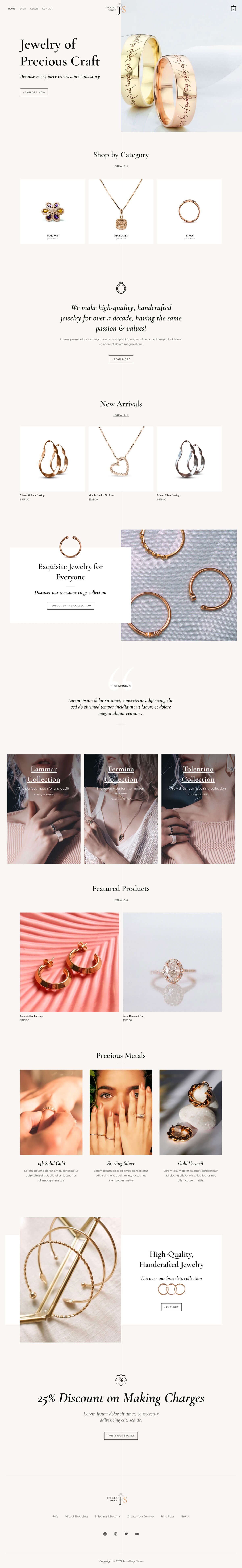 The clean and minimalistic design has all the correct elements to help you build a high-converting store. From impressive background effects to displaying products based on categories and latest arrivals, Jewellery Store is the perfect web template for your store.