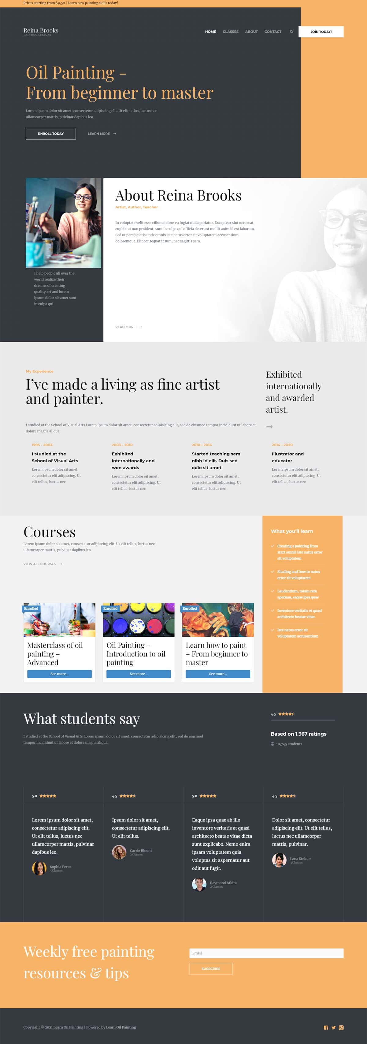 The Learn Oil Painting template is built ready for eLearning. While art is the subject here, it could easily be customized to suit any niche. It’s an informative website with great colors, a mix of elegant fonts and some powerful imagery.