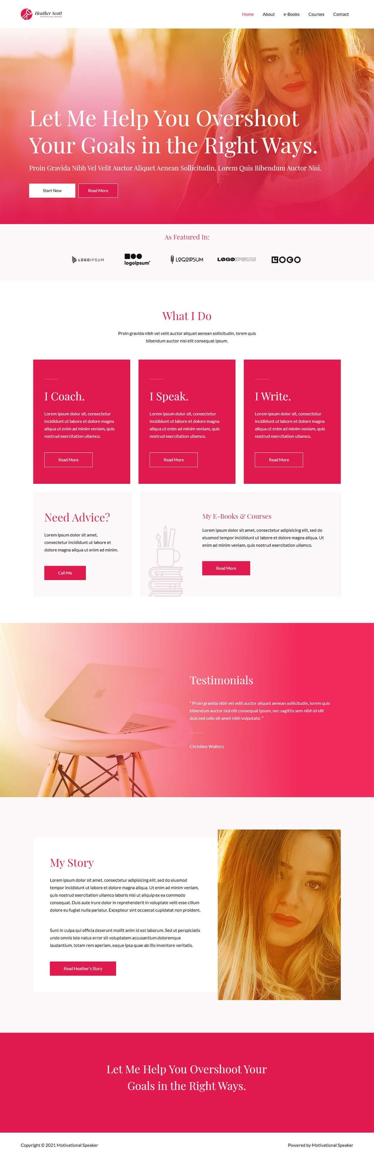 The Motivational Speaker template just oozes positivity, ideal for a motivational speaker or similar niche. It starts off bold with a full screen image and bright colors before opening out into a high contrast business website layout.