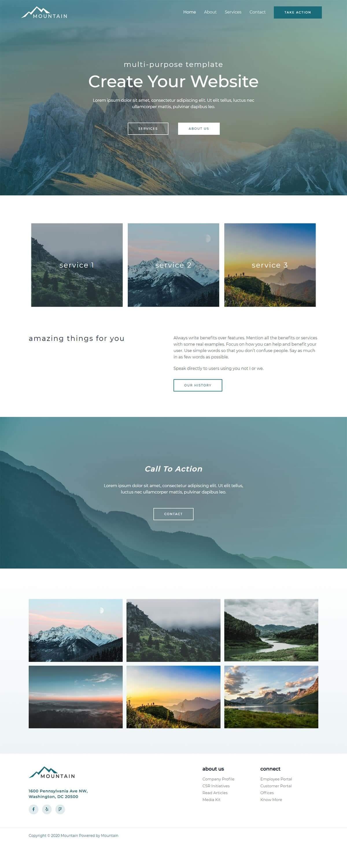 Offer your services on the homepage and in the provided service page template. The template comes with a significant hero image that includes CTA buttons. Additionally, share those breathtaking mountain photos to entice your audience.