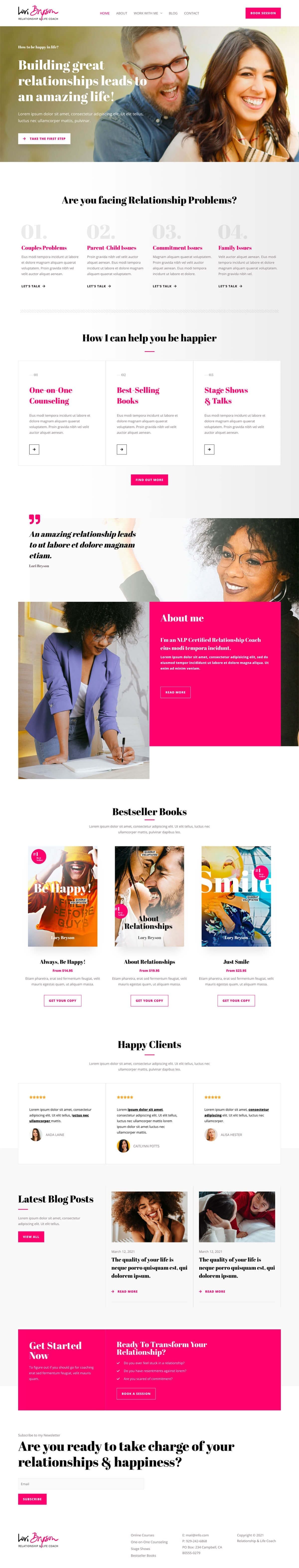 Are you a relationship coach? Want to offer services, such as couples problems, parent-child issues, and family issues, among other things? Build a website using our Relationship Coach template and help prospective clients to seek guidance and consultation from you, irrespective of their location.