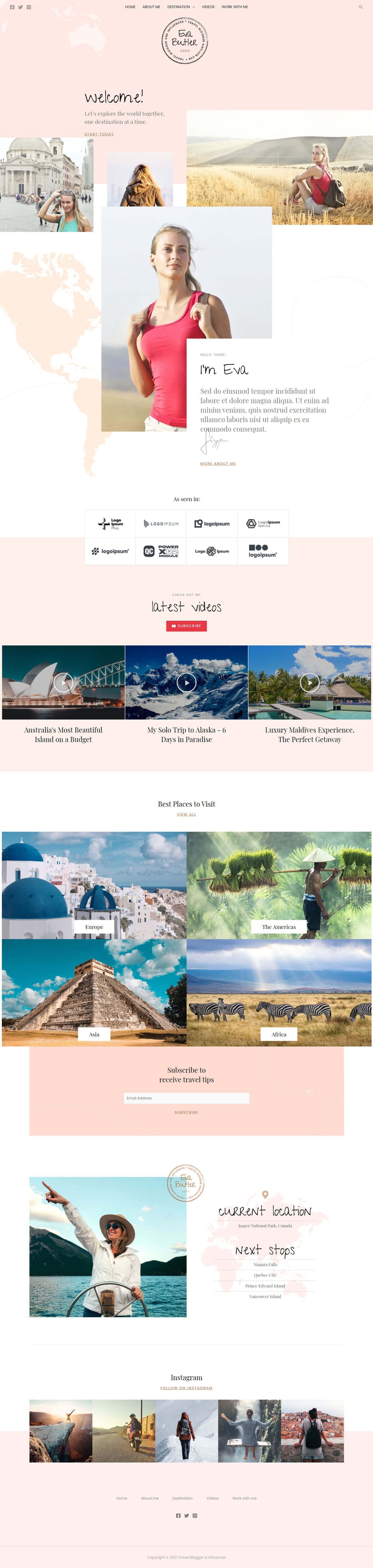 The engaging website template is designed to help you promote yourself as the face behind the blog. Additionally, you can publish blogs, upload and share videos, provide insights into your next travel destination, and even integrate your Instagram feed on your homepage.
