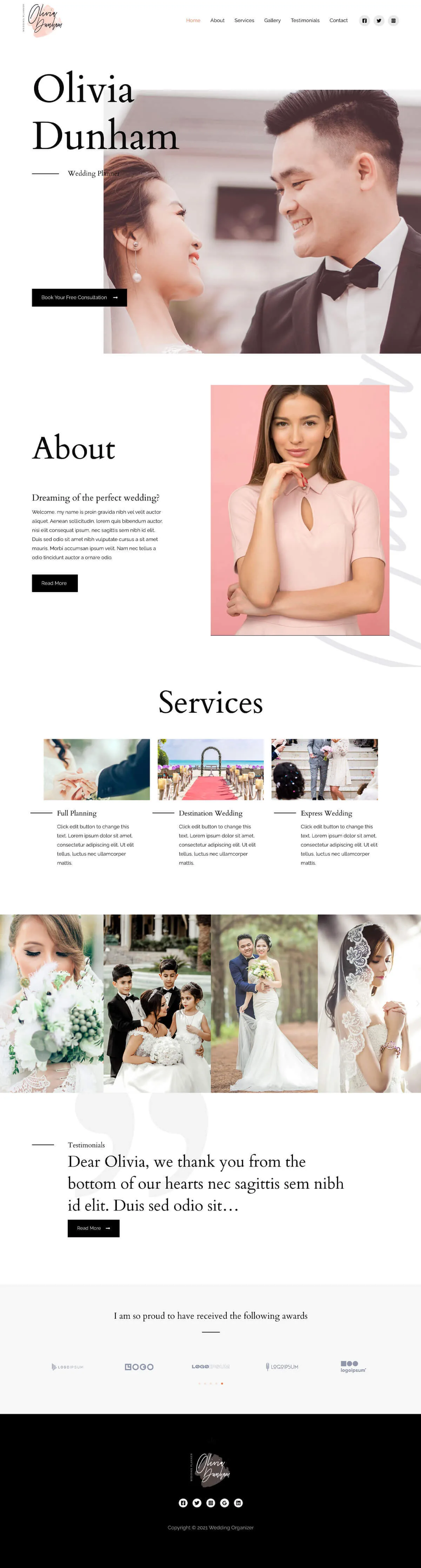 The Wedding Organizer template has a romantic feel that’s balanced with a business layout to combine the two things visitors want to see. It’s light, welcoming and charming in equal measure.