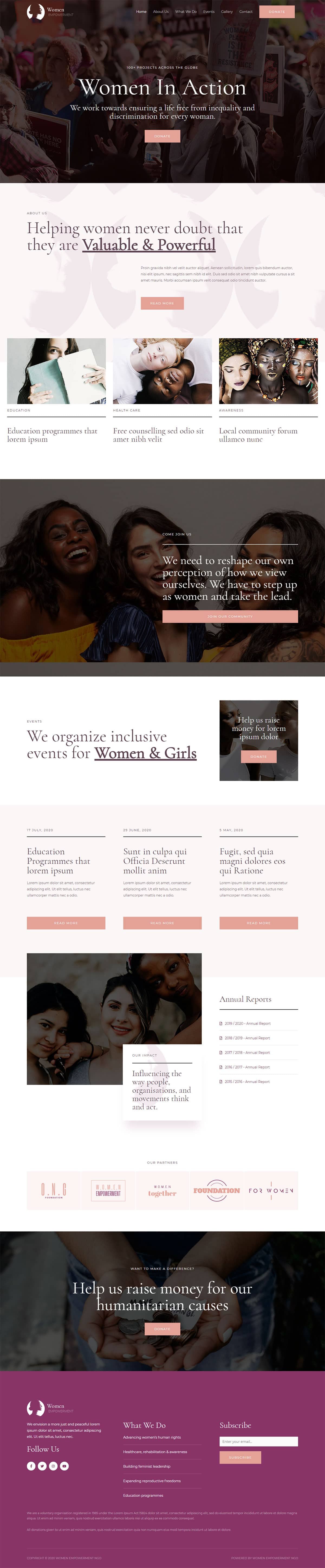 The Women Empowerment NGO template delivers a pleasant feel as soon as it loads. It opens with a fullscreen image header with soft colors and modest headline before flowing into an alternating light and dark homepage.